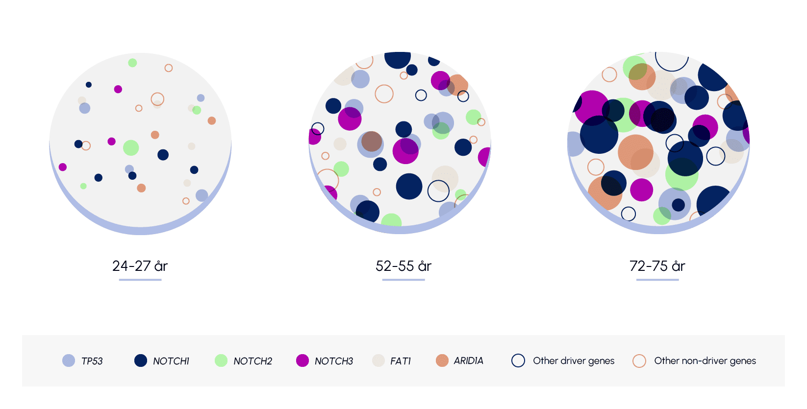 Figur 8. Figuren visar mutationsanalys av till synes normal esofagusslemhinna i olika åldrar. Varje panel är en schematisk illustration av en representativ 1 cm²-yta av histologiskt normal matstrupe från donatorer i tre ålderskategorier. Muterade kloner är representerade som cirklar där färgen beskriver vilken gen som är muterad och storleken beräknats från hur prevalent mutationen var i sekvenseringsdata.