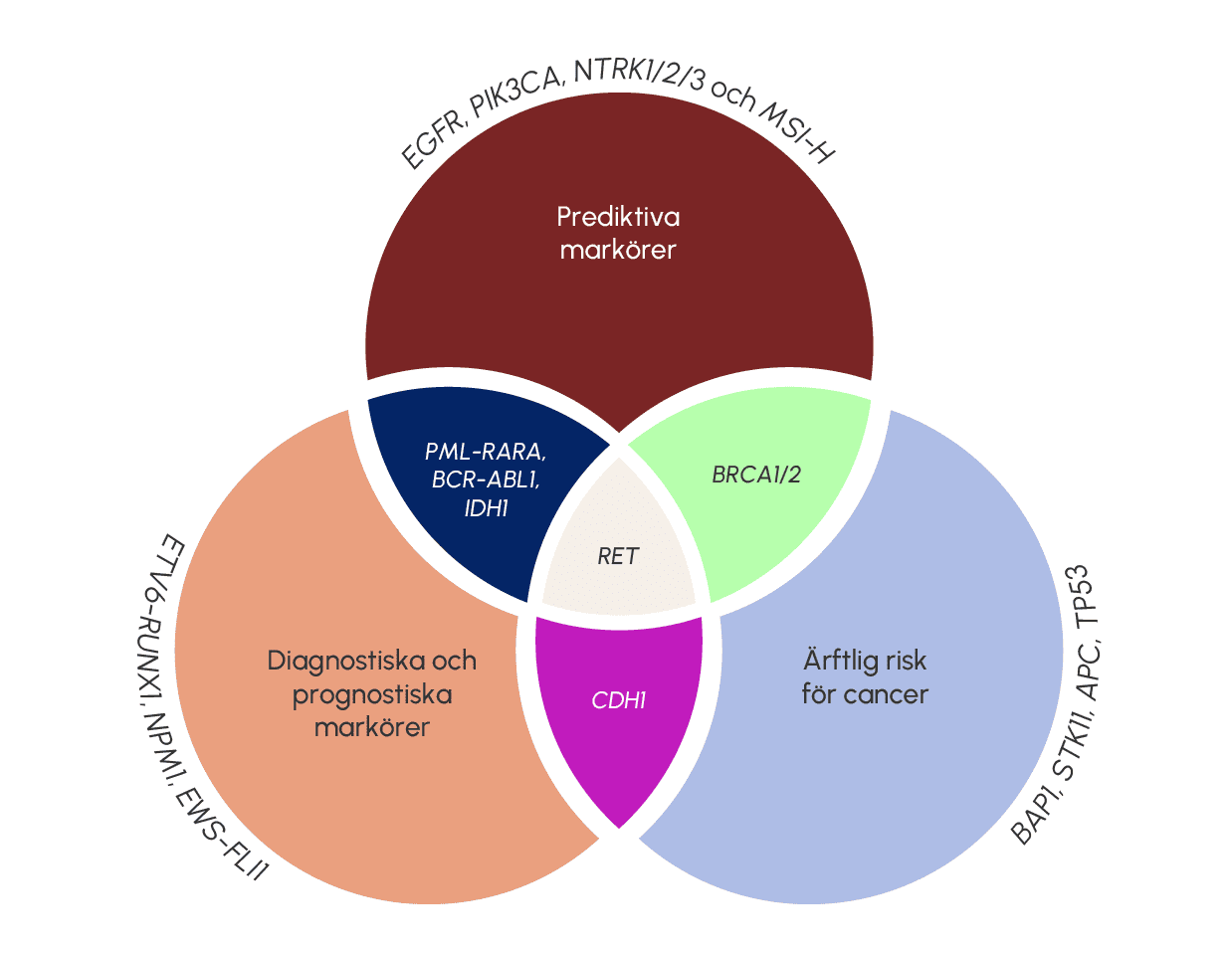 Figur 1. Molekylärpatologins uppdrag inom klinisk patologi. De största uppgifterna kan delas in i att hitta biomarkörer som hjälper till att ställa rätt diagnos, avgöra om en patient förväntas svara på terapi eller ej samt i vissa fall om patienten har indikation på att ha en ärftlig risk för cancer. Vissa markörer, till exempel avvikelser i RET-genen, är användbara i flera kontexter.